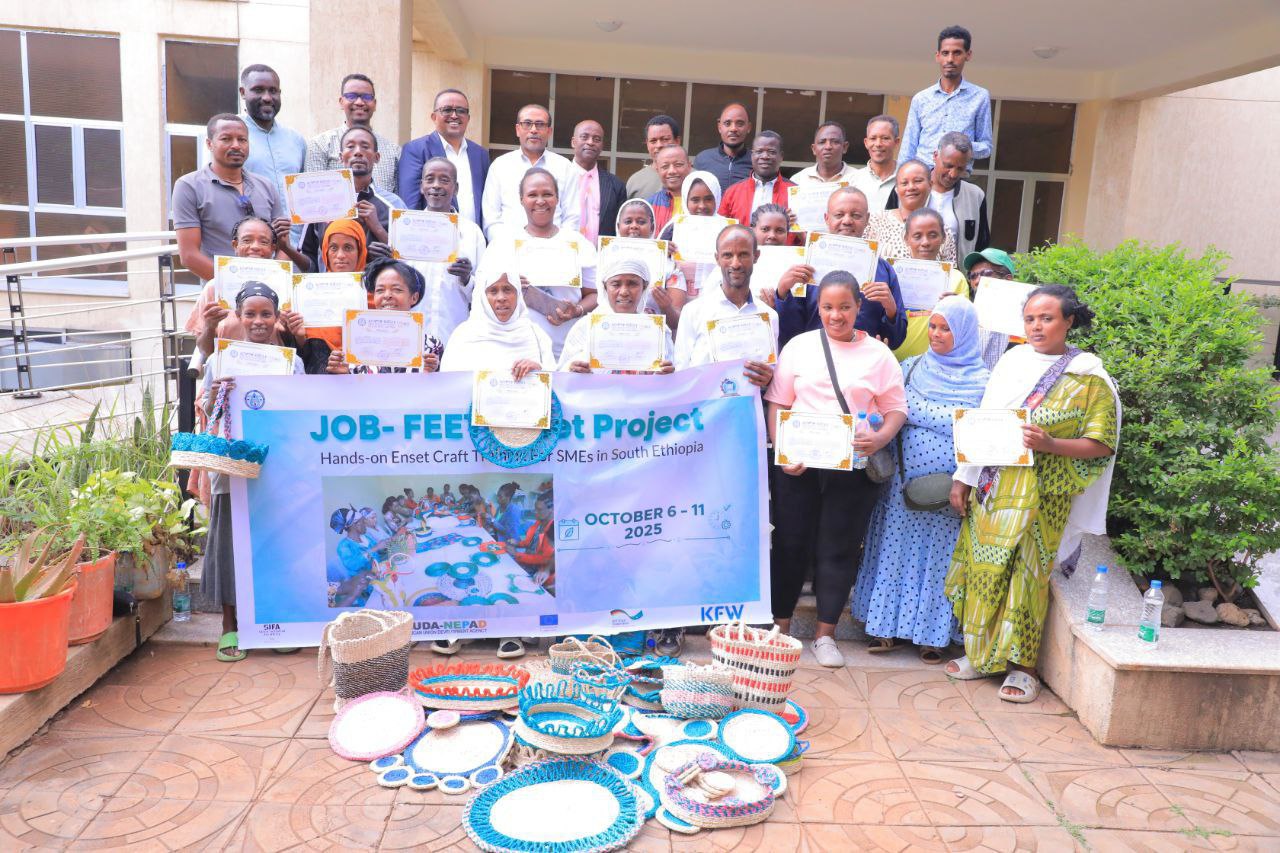 Arba Minch University (AMU) - SIFA JOB FEET project rendered a five-day hands-on training on enset fiber products to boost female employability and entrepreneurship from October 6 – 11, 2025 at Abaya Campus; 20 beneficiaries from four local SMEs participated. Click here to see more photos.