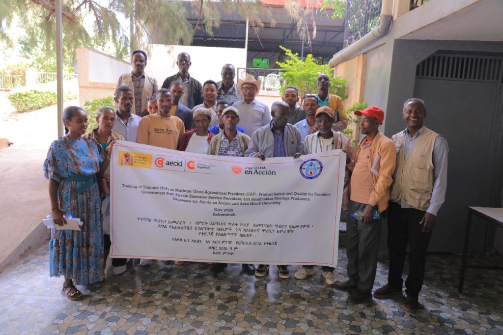 Arba Minch University (AMU), in partnership with Ayuda en Acción, conducted a three-day Training of Trainers (ToT) program titled “Moringa: Good Agricultural Practices, Product Safety, and Quality” from December 2 to 4, 2025 at Arba Minch. The training brought together smallholder moringa producers from the Wolayita and Gamo zones of the South Ethiopia Region. It aimed to enhance participants’ technical capacity and promote improved practices in moringa cultivation, value addition, and market system development. Click here to see more photos.