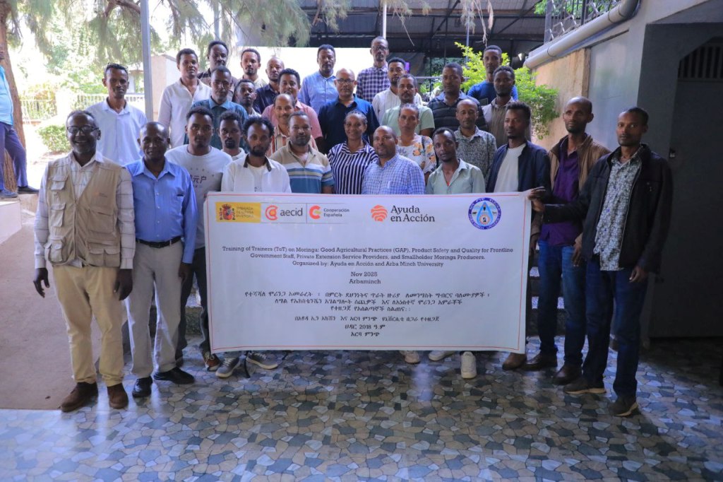 Arba Minch University (AMU), along with Ayuda en Acción, conducted a three-day Training of Trainers (ToT) program on Moringa: Good Agricultural Practices, Product Safety, and Quality. The training brought together frontline government staff, private extension service providers, and smallholder moringa producers from two zones in the South Ethiopia Region. Held from November 25–27 at Lambadina Hotel in Arba Minch, the program aimed to enhance participants’ technical capacity and promote improved moringa cultivation and value-chain practices. Click here to see more photos.