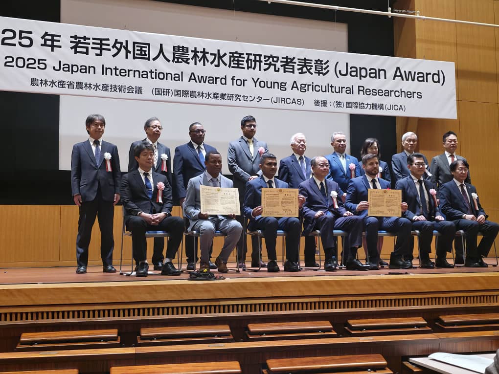 Arba Minch University (AMU)’s senior Enset researcher and innovator, Dr. Addisu Fekadu along with Dr. Vignesh Muthusamy from Indian Agricultural Research Institute, India, and Dr. Ivan Eduardo Ramirez Morales from Technological University of Machala, Ecuador, won the 19th Japan International Award 2025 for Young Agricultural Researchers at the ceremony held on October 27, 2025 at National Center of Sciences Building in Hitotsubashi Hall, Tokyo. Ethiopian Ambassador Extraordinary and Plenipotentiary to Japan, H.E Ambassador Daba Debele Hunde, Dr. Teklu Wegayehu, AMU Vice President for Research and Cooperation, Dr. Dagnew Mache, postdoctoral fellow of Japan Society for the Promotion of Science (JSPS) at the University of Tsukuba, graced the awarding ceremony. Click here to see more photos.