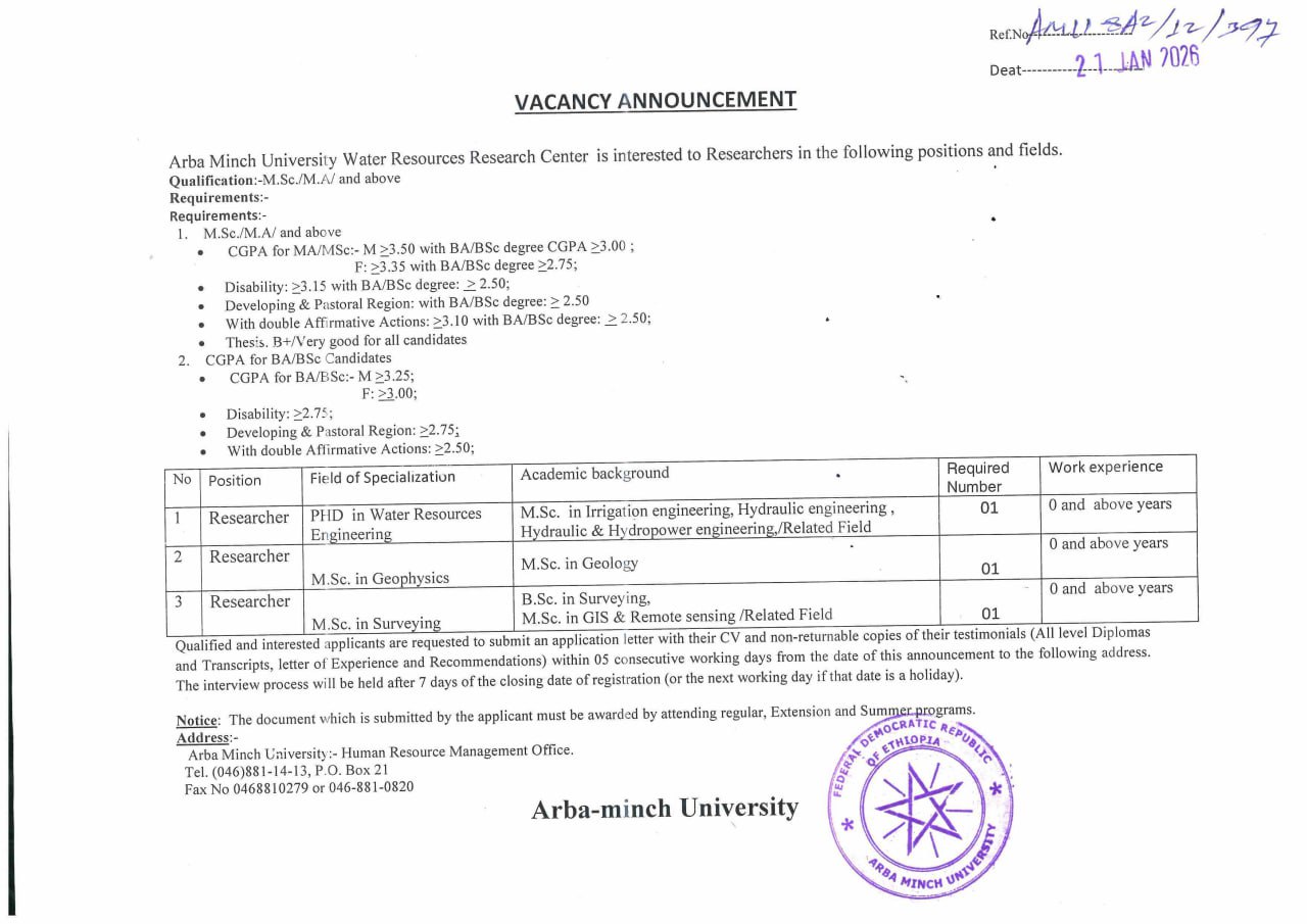 Arba Minch University (AMU) Water Resources Research Center is interested in researchers in the following positions and areas: